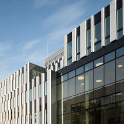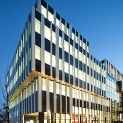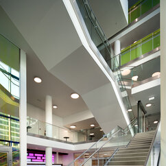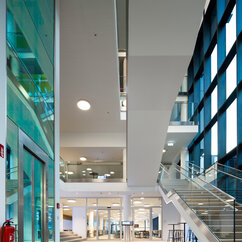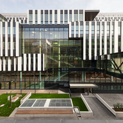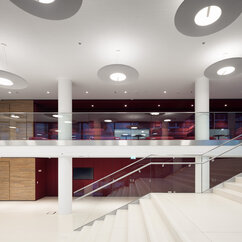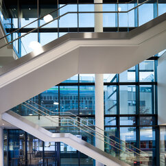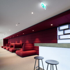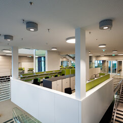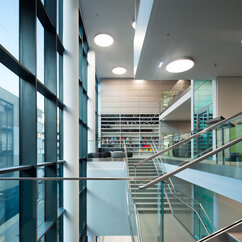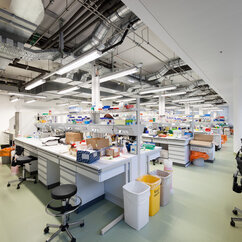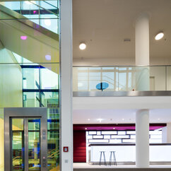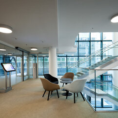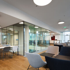 The 250 staff members of the IMP benefit from light-flooded offices, generous lab space, individual working-desks on split-level floors, and the biggest lecture hall on campus. The generous dimensions of the cafeteria, bar area and tea kitchen, along with stylish furniture and controlled acoustics, support a pleasant work atmosphere where creativity can thrive.