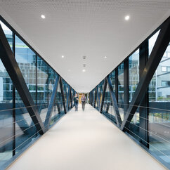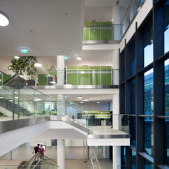 One goal of the architects planning the IMP building was to enhance communication. Open working spaces and meeting points increase opportunities for interaction within labs and throughout the institute. The building offers state-of-the-art facilities that can be easily adapted to changing research needs in the future. Advanced air-conditioning, LED-lighting and self-shading electrochromic glass are some of the features that contribute to personal well-being and save costs by using energy efficiently.