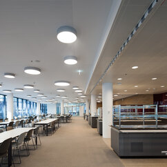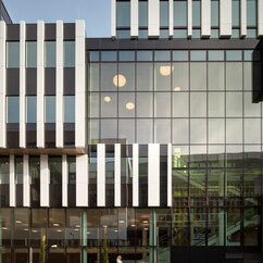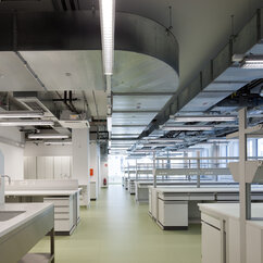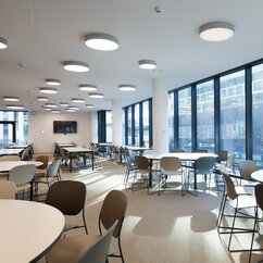 The 250 staff members of the IMP benefit from light-flooded offices, generous lab space, individual working-desks on split-level floors, and the biggest lecture hall on campus. The generous dimensions of the cafeteria, bar area and tea kitchen, along with stylish furniture and controlled acoustics, support a pleasant work atmosphere where creativity can thrive.