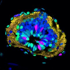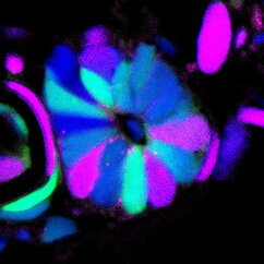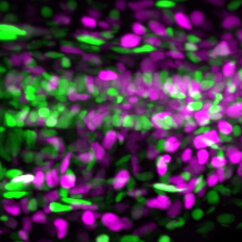 3D reconstruction of axolotl tail tissue. The spinal cord is the tube-shaped structure in the middle. Proliferating cells are magenta, resting cells are green and cell nuclei are stained in blue.