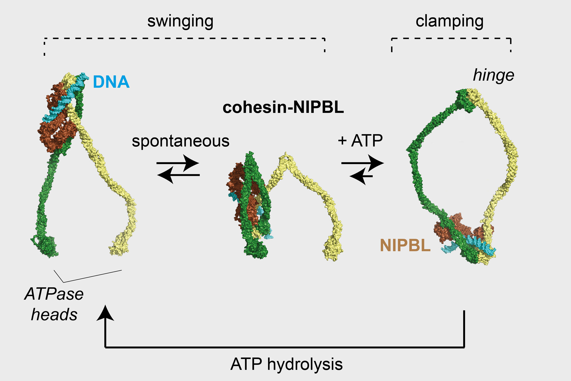 The cohesin complex has the shape of a wishbone, with two extremities connected by a hinge. The hinge is the first point of contact to DNA, which it binds with the help of NIPBL. Cohesin then folds its arms and the hinge swings to hand DNA over to one of the extremities, where another binding site can attach to DNA. NIPBL clamps DNA to the arm’s binding site, where it remains while the hinge regains its initial position, ready to grab another section of DNA. The cycle repeats itself to continue folding DNA into loops.