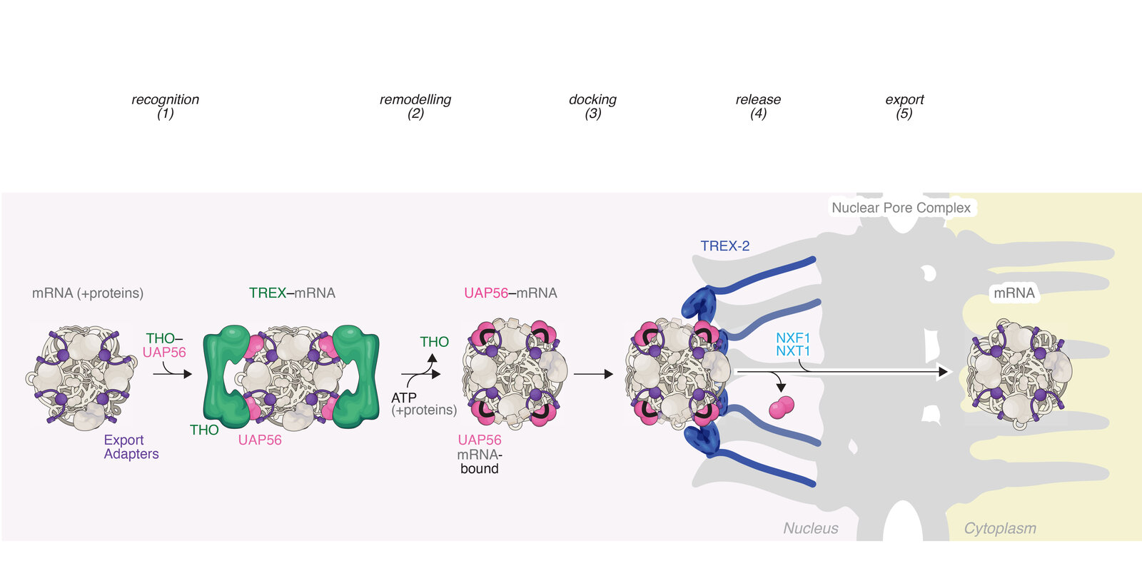 Every cell depends on the controlled flow of genetic information. While the DNA remains securely stored in the nucleus, its instructions must exit the nucleus, for proteins—the building blocks of life—to be made. These instructions exit the nucleus as special molecules, messenger RNAs (mRNAs), in a process critical to every eukaryotic organism. Many key proteins involved in mRNA export are long known, but how they work together to get mRNAs out of the nucleus remained unclear.