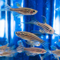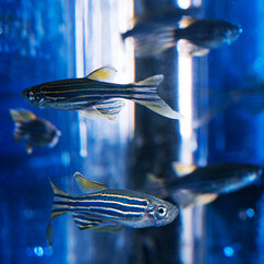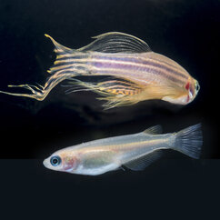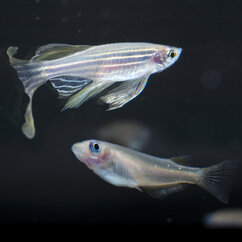 Caption for the image file provided below: “Adult medaka (Oryzias latipes, top) and zebrafish (Danio rerio, bottom)”.